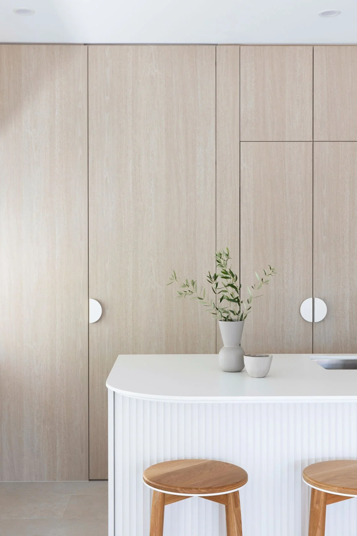 Zephyr and Stone • Contemporary Coastal Kitchen With White Half Circle Handles